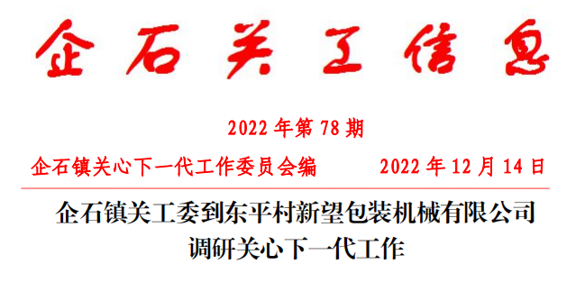 12 月 14 日上午,企石鎮(zhèn)關(guān)工委到東平村新望包裝機械有限公司調(diào)研關(guān)心下一代工作。企石鎮(zhèn)關(guān)工委主任楊煥柱,關(guān)工委副主任黃林燦、劉毅然,東平村關(guān)工委主任李堯木,公司董事長羅永輝等參加了調(diào)研活動。